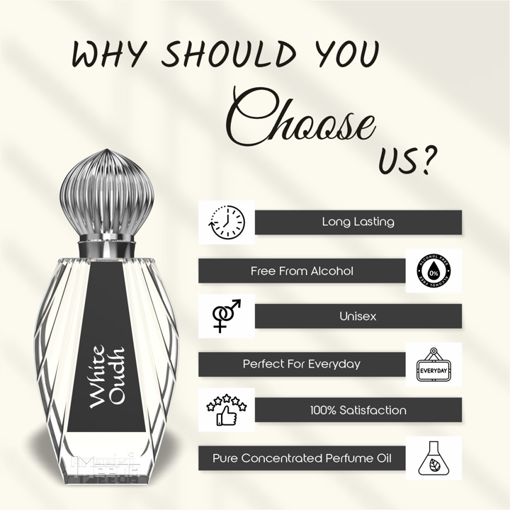 White Oudh Attar 20ML blends soft floral tones with deep woody and balsamic layers, enriched by warm amber and exotic agarwood. A long-lasting, elegant scent rooted in tradition and luxury.